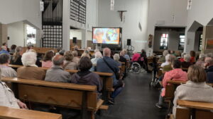 150 Zuschauer/innen waren am 21. September in die Kulturkirche gekommen. Der Beamer stand direkt auf dem Altar und unter dem Kreuz war der Film zu sehen. Für mich eine ganz bemerkenswerte Veranstaltung, die mir wieder gezeigt hat, dass mein Anliegen „ankommt“: Menschen interssieren sich sehr für die Dinge, die vor ihrer Haustür passieren oder passiert sind. Heimatgeschichte  …